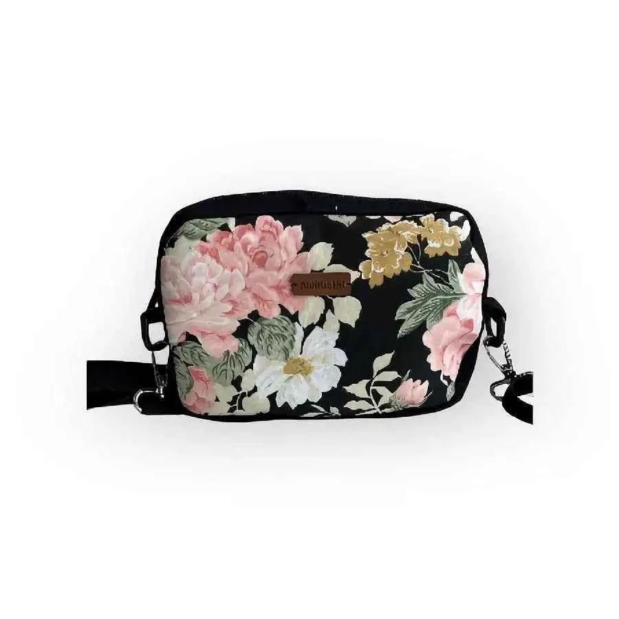 The trapezoidal small shoulder bag is made of thick cotton and has double reinforcements on the front and back, ensuring the bag's sturdiness and durability. The bag is available in two color options: a blue-toned "Cup Cake" and a black-based floral pattern.