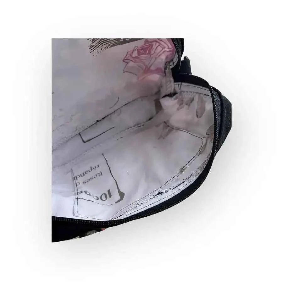 The inside is lined with cotton and has a small pocket for small items. The bag closes with a zipper to keep your belongings safe. The adjustable shoulder strap has a maximum length of 130 cm, so you can carry the bag comfortably on your shoulder or across your body.