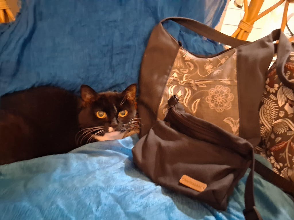 The bag has a small zippered pocket on the inside, perfect for storing small items. There is also a pocket on the front, in the patterned section, for additional storage space. The bag closes with a zipper, keeping your belongings safe.