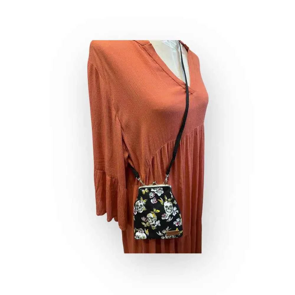 Kukkarolaukku Kallossa mustalla pohjalla seikkailee iloisia pääkalloja seuranaan keltaiset perhoset ja kukkaset. Etupuoli on kuvioitu ja takapuoli koko musta. Vuoriin on ommeltu hihna, josta löytyy avainlenkki. Näin avaimet pysyvät aina käden ulottuvilla.