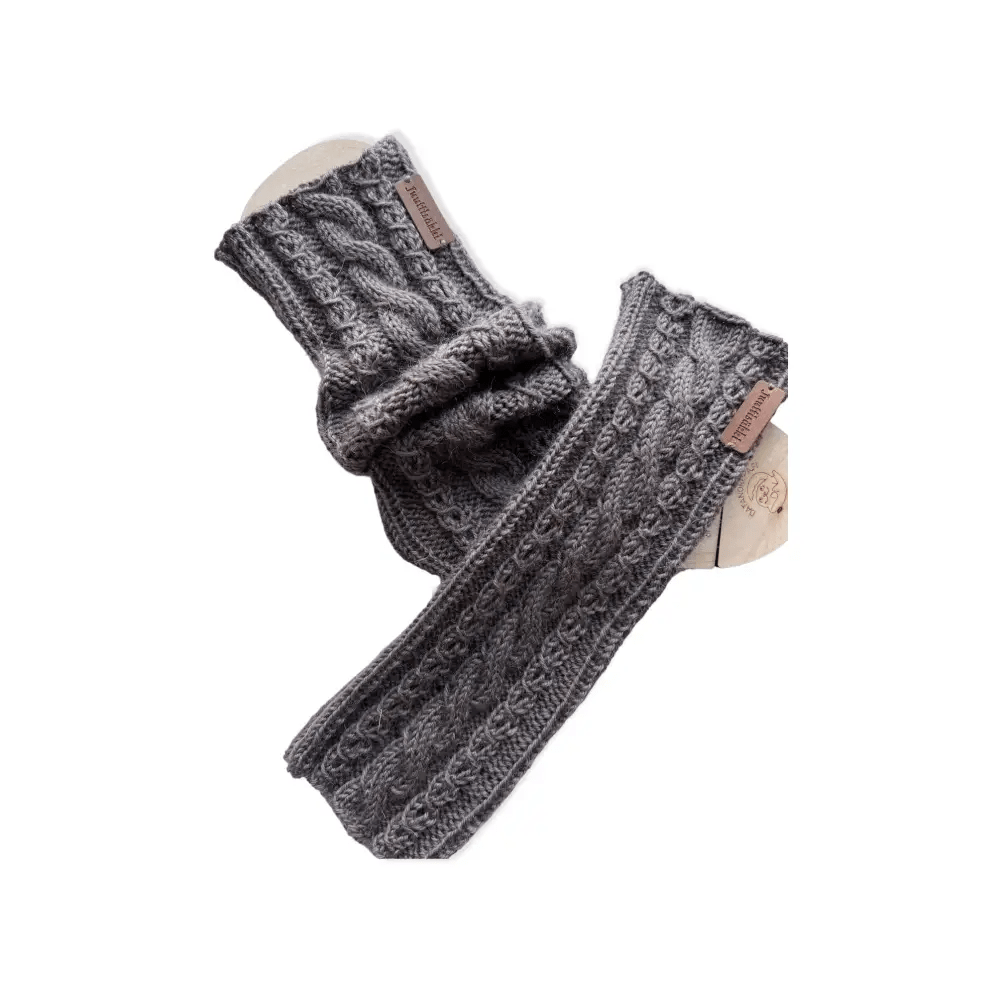 Pehmeän ruskeat säärystimet, joissa on etupuolella neulottua palmikkoa ja takana joustinneuletta, tuovat lämmön tunteen jaloillesi. 32 cm pituus suojaa pohkeita ja nilkkoja mukavasti, ja tyylikäs Juuttisäkin nahkamerkki tuo viimeistellyn ja hienostuneen yksityiskohdan.