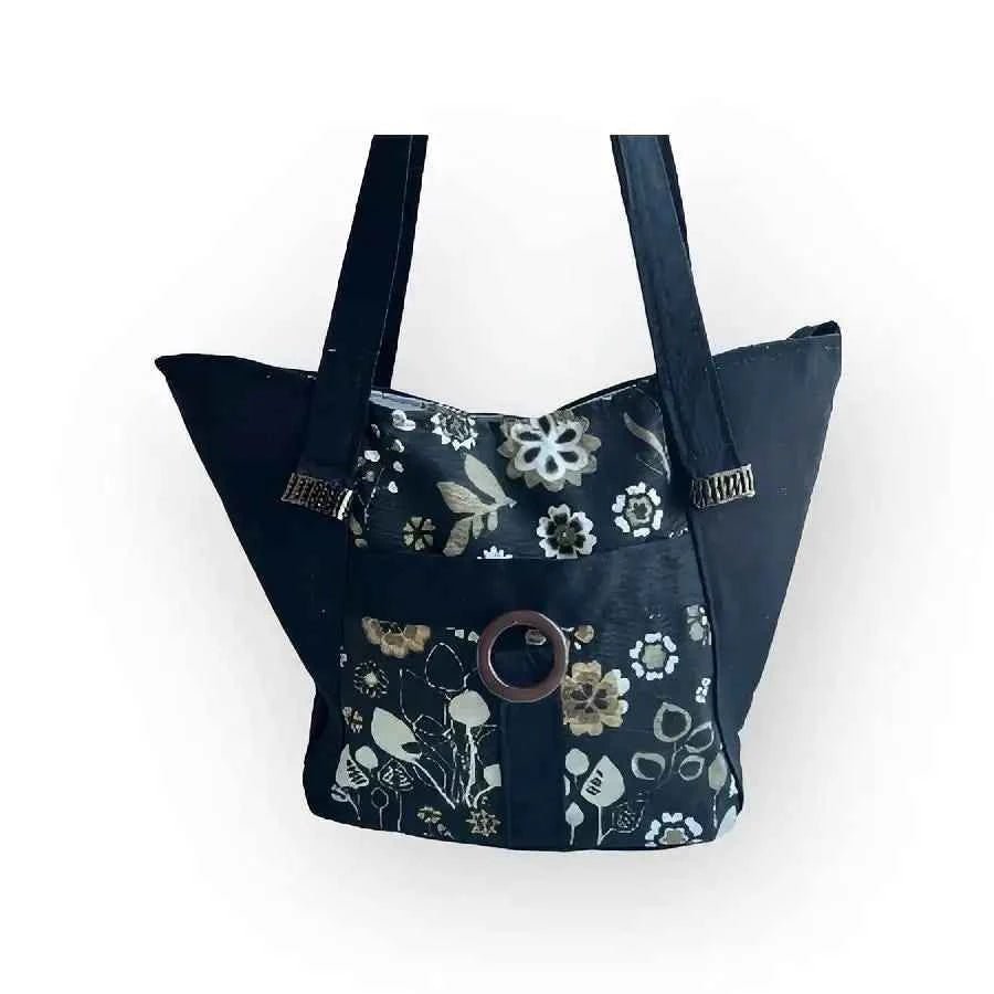 Denna vackra svarta axelväska med en brun blommönstrad framsida är den perfekta kombinationen av stil och funktionalitet. Tillverkad av kraftigt svart bomullstyg och blommönstrad bomull, är väskan slitstark och lättskött.