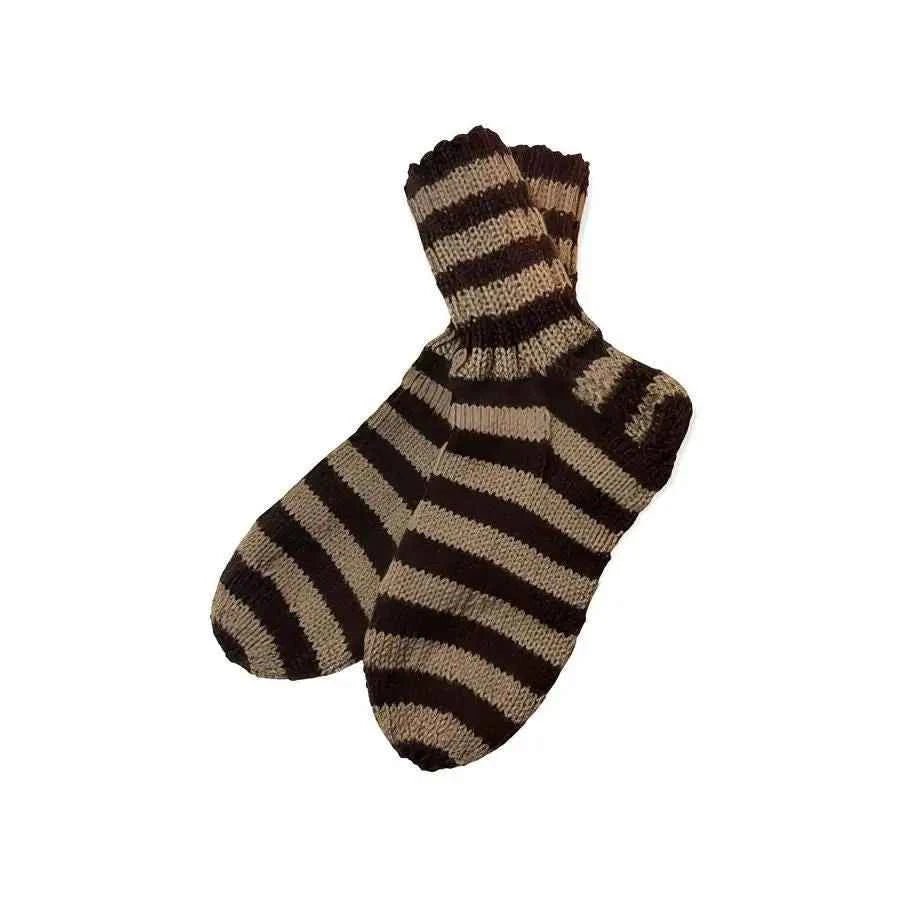 Njut av höststämningen med varma brunrandiga ullstrumpor. Randiga strumpor erbjuder komfort och skydd, och de mörka och ljusbruna ränderna ger en stilfull look till din outfit.