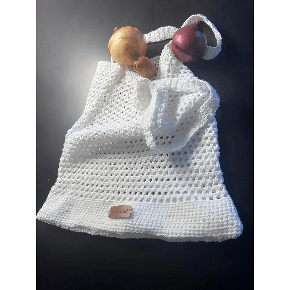 En liten vit nätpåse virkad av bomullsgarn är lämplig för att förvara grönsaker, lök och frukt och transportera dem från butiken till ditt hem. Meshväskan passar även utmärkt som gymväska eller för att transportera dina baddräkter hem från stranden.